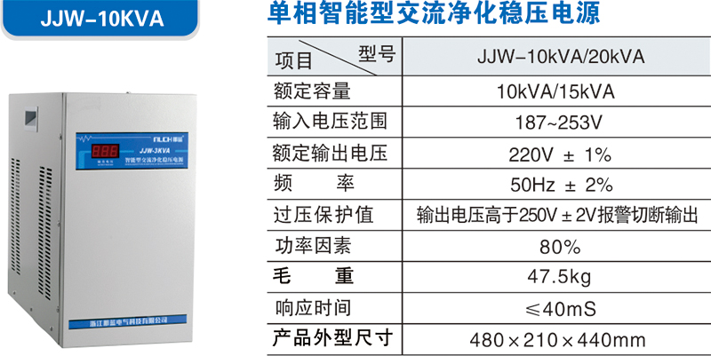 JJW系列智能型交流净化稳压电源是一种高性能新型电子式交流稳压电源设备,是目前国际上流行的性能比较优越的交流稳压电源品种之一,被广泛应用于高精尖电器设备和常规用电设备的供电稳压。