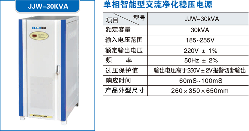 JJW系列智能型交流净化稳压电源是一种高性能新型电子式交流稳压电源设备,是目前国际上流行的性能比较优越的交流稳压电源品种之一,被广泛应用于高精尖电器设备和常规用电设备的供电稳压。
