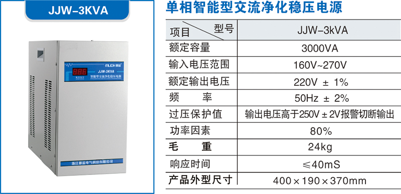 JJW系列智能型交流净化稳压电源是一种高性能新型电子式交流稳压电源设备,是目前国际上流行的性能比较优越的交流稳压电源品种之一,被广泛应用于高精尖电器设备和常规用电设备的供电稳压。