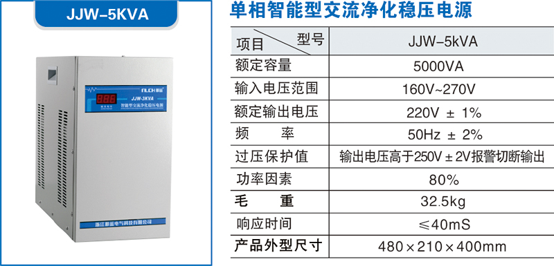 JJW系列智能型交流净化稳压电源是一种高性能新型电子式交流稳压电源设备,是目前国际上流行的性能比较优越的交流稳压电源品种之一,被广泛应用于高精尖电器设备和常规用电设备的供电稳压。